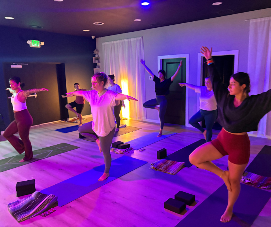 Women taking a yoga class in a dimly lit room with colorful lights, yoga mats, and blocks.